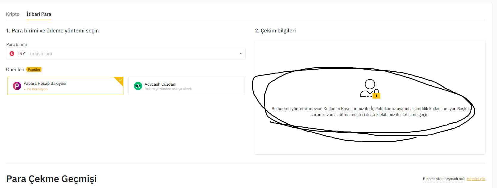 Selamlar herkese. Binance cüzdanımdaki 114 TL'lik Ethereum'u çekemiyorum. Bu ödeme yöntemi şimdilik kullanılamıyor diyor. 3-4 gündür böyle, düzelmedi. Hesabım doğrulandı, tüm doğrulama seçenekleri aktif fakat paramı çekemiyorum. Sorun nedir?