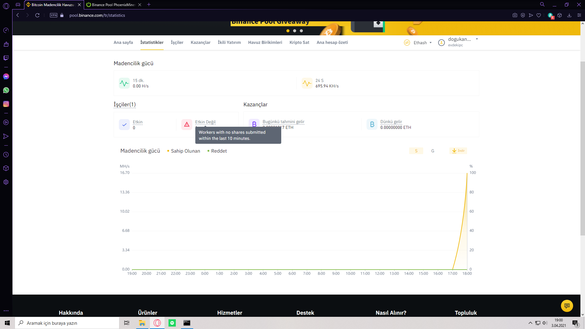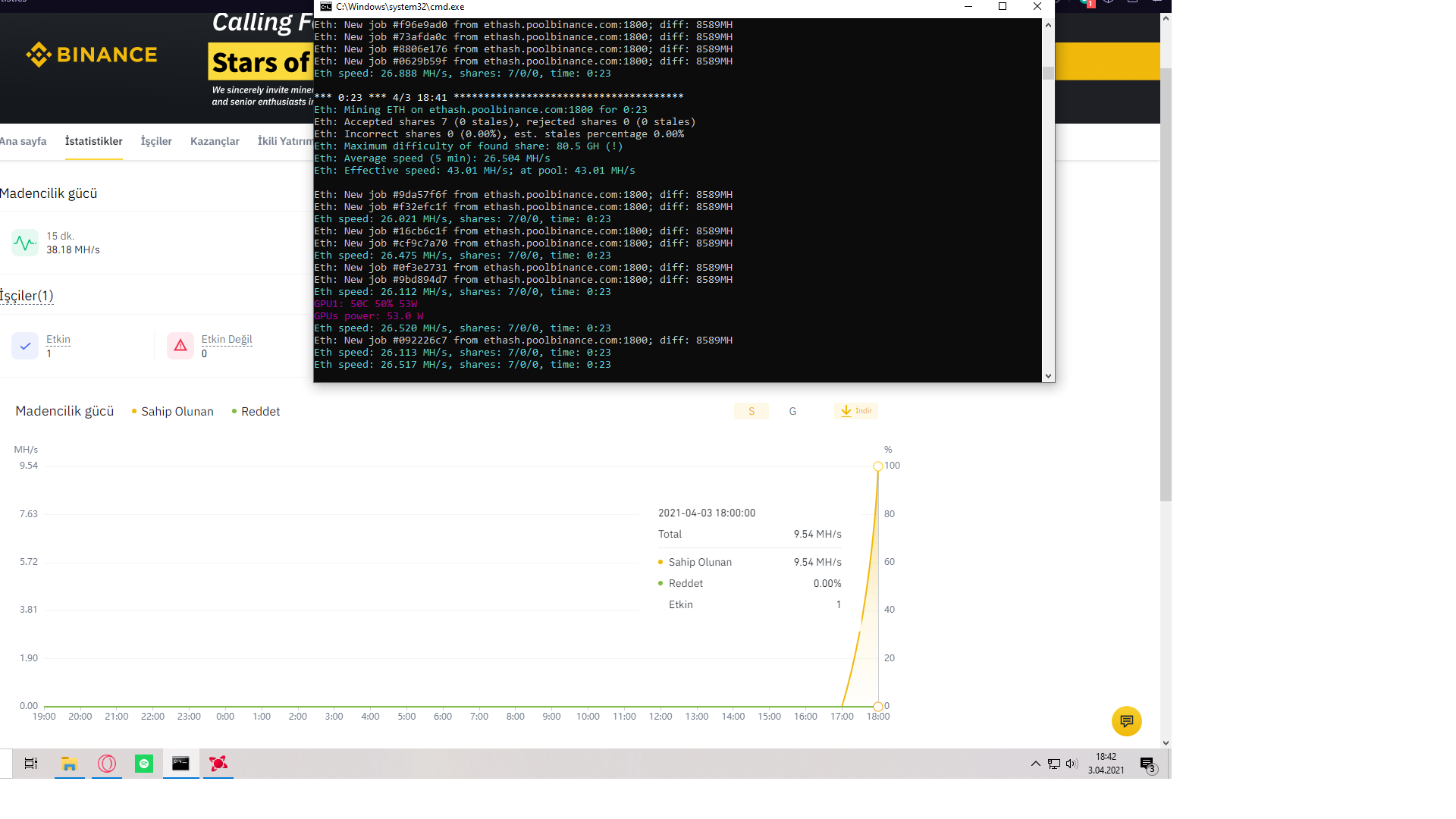 O da aynı şekilde sitenin sunucularından kaynaklı geç geliyor. Bir iki saat kazdıktan sonra eşitlendiğini göreceksiniz. Sizin için önemli olan kısım CMD ekranı yani Phoenix Miner. Orada yazanı kazarsınız Binance ekranı sadece ne kadar kazdığınızı, ortalama kazım hızınızı ve onun gibi bilgileri tek bir ekrandan görmenizi sağlar. İsterseniz kapatabilirsiniz bir sorun çıkmayacaktır. Phoenix Miner ekranında yazanlar sizin gerçek değerlerinizdir her zaman.