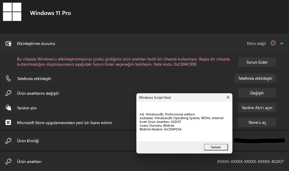 ASUS Prime B550M-A anakartım var dün en son çıkan BIOS sürümünü yükledim ve birkaç saat sonra sağ altta Windows'u etkinleştir yazısı çıktı. Mail adresime bağlı Retail key kullanıyordum ancak Microsoft'un sitesine girdiğimde ne şu anki masaüstü bilgisayarımın keyi ne de dizüstü bilgisayarın keyi görünmüyor. Ancak CMD üzerinden sorguladığımda Retail key görünüyor.
