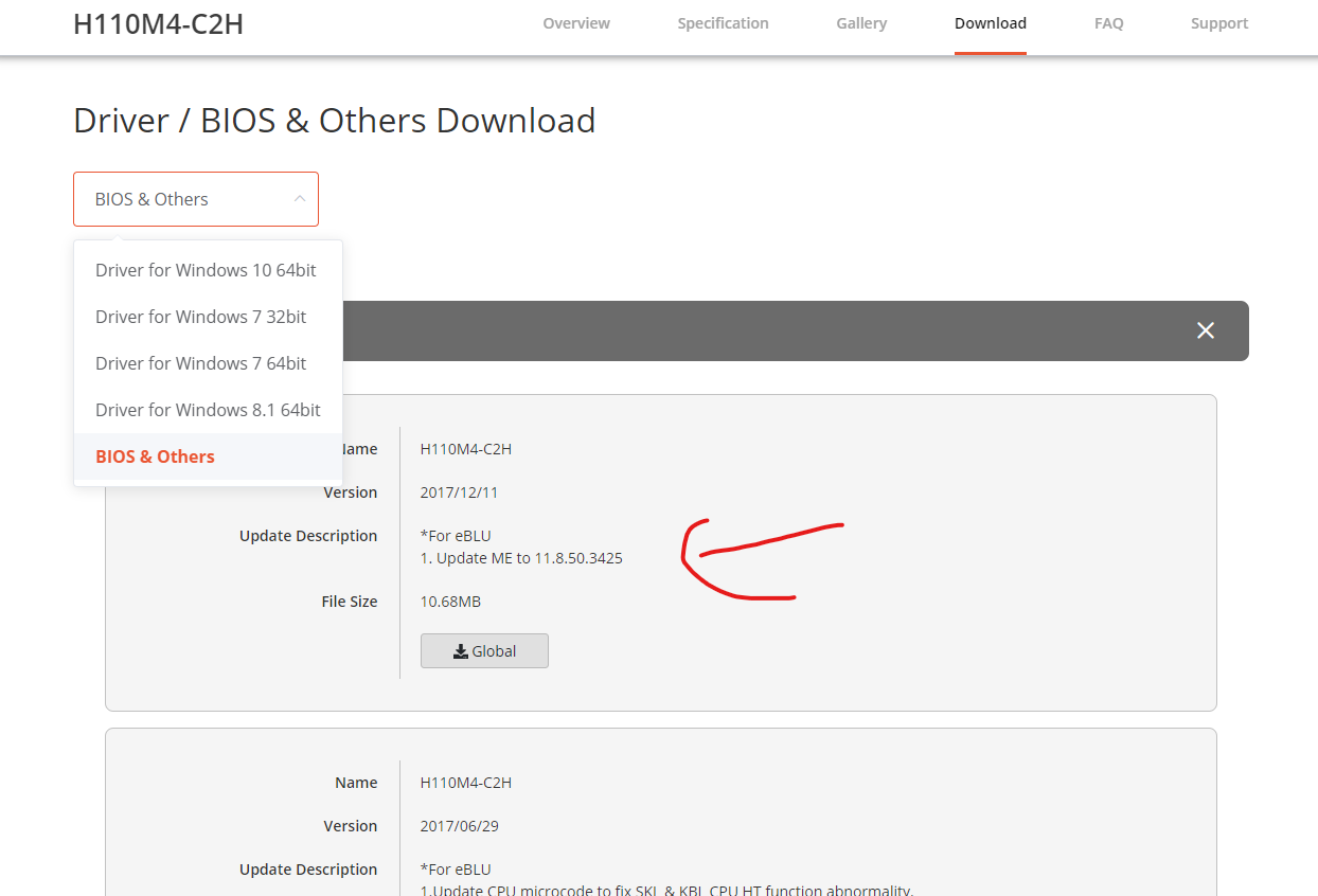 Verdiğiniz link ve görsel üzerinden görebildiğim kadarıyla anakartınız H110M4 C2H modeli ve üretici firmanın sitesinde Driver/Bios sekmesine bakınca bir güncelleme gözükmemekte hocam