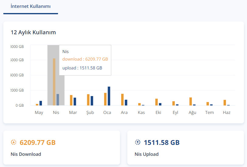 Geçen ay 6.2 TB indirme ve 1.5 TB yükleme yapmışım. (100 Mbps indirme hızı ve 8 Mbps yükleme hızı ile.)