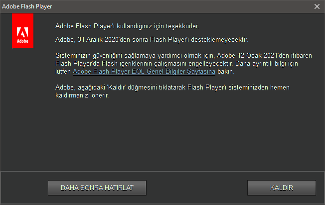 Ekran kartsız bilgisayarlarımızda oyun deneyimi yaşatan ve bilgisayarımızda yüklü olmadığında eksikliğini hissettiğimiz 1996'dan beri hayatımızda olan Adobe Flash Player desteği yarın (hatta birkaç dakika sonra) son buluyor. Microsoft da yüklü olan bilgisayarlarda kaldırılmasını tavsiye ediyor güvenlik açıklarından dolayı. Güle Güle Flash Player bize kattığın her şey için teşekkürler. :( Ağlamıyorum gözüme Armor Games kaçtı ve OYUNLAR1 kaçtı.