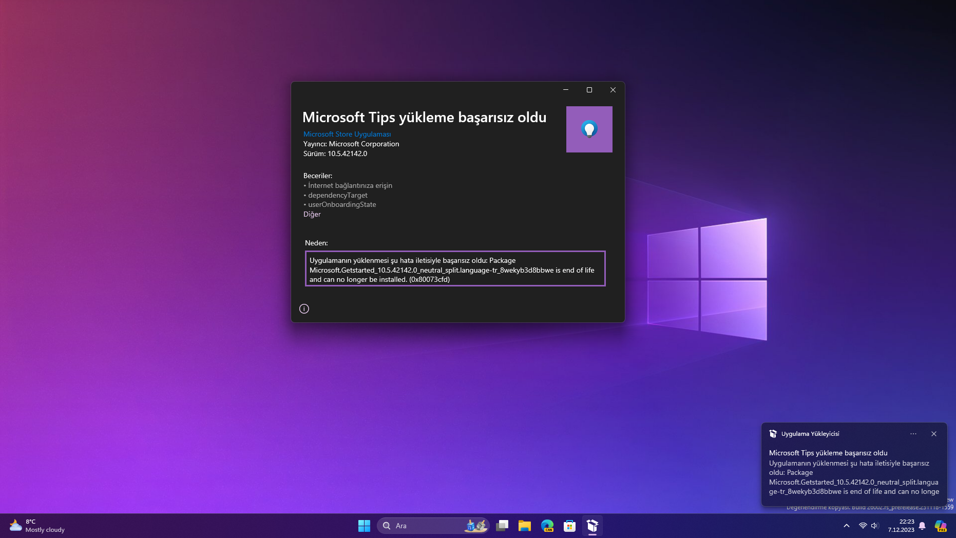 Windows 11 build 26002'den itibaren ipuçları, varsayılan olarak Windows'ta yer almaz ve Microsoft Store'dan ya da uygulama paketini kullanarak yüklemeye çalışmak hataya sebep olur.