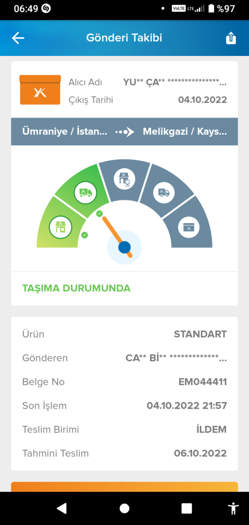 Evet kargom dün verilmiş Kayseri'ye, bugün gelir mi?