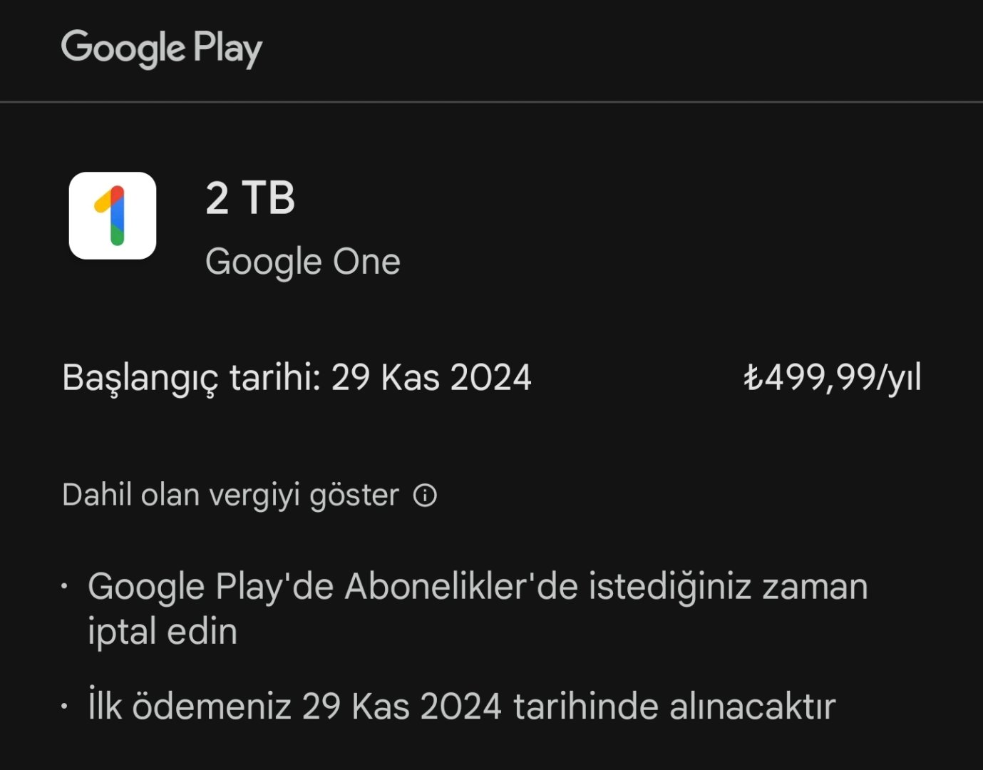 Dün bitmesine sekiz gün kalan Google One iki TB üyeliğimi ekran görüntüsünde görüldüğü gibi uzattım.