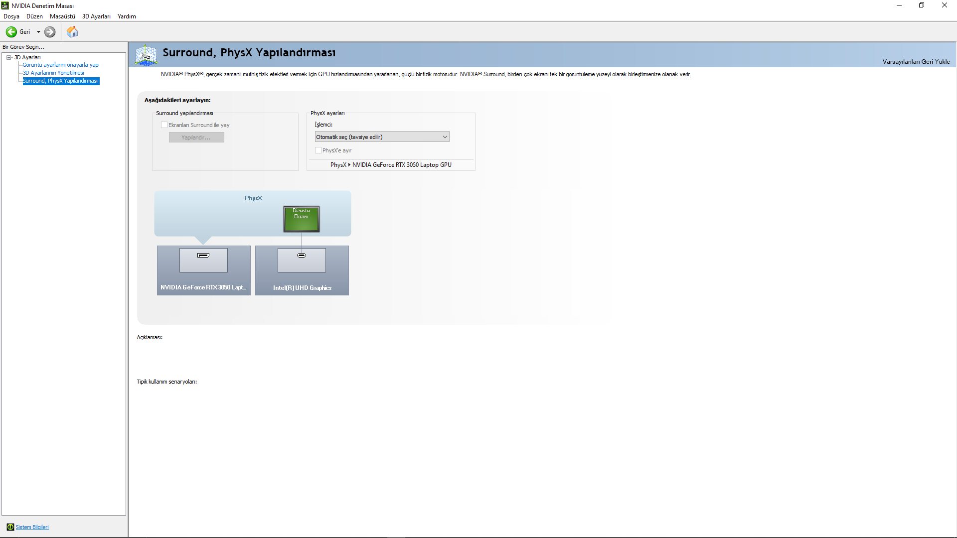 DxDiag'da 1 görüntüsü olarak HD Graphics'i görüyor. İkinci olarak NVIDIA ekran kartımı görüyor. Keza az evvel görev yöneticisinde GPU olarak HD Graphics'i görüyor. Tam olarak anlamıyorum bunu ancak birincil ekran kartı olarak HD Graphics'i mi görüyor? Oyunlarda ya da günlük kullanımda hiçbir problem yaşamıyorum ama ilerleyen dönemlerde yaşatır mı merak ettim.