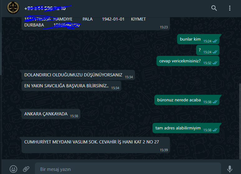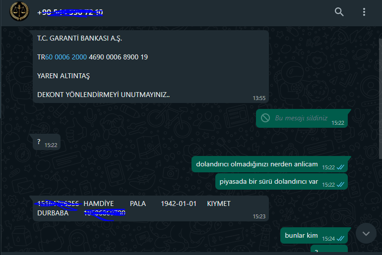 Merhaba, bugün beni birisi aradı ve yasal olmayan bahis sitelerine kayıt ve jigololuk nedeniyle hakkımda dava açıldığını söyledi ve itiraz başvurusu için 1050 TL para göndermemi istediler. Benim o suçlardan hiçbiri ile ilgim yok. Beni aradıklarından sonra kapattım ve bana WhatsApp'dan IBAN bilgisi gönderdiler ve ben de dolandırıcı olmadığınızı nasıl anliyacağım dedim ve bana telefonumun eski hat sahiplerinin isimlerini ve T.C.'lerini söylediler, ne yapmalıyım?