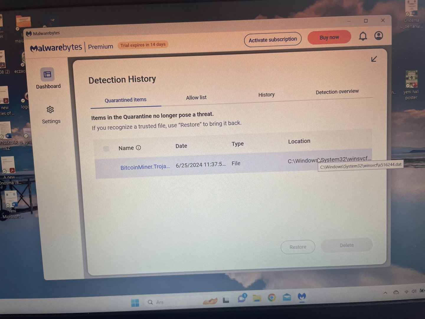 Malwarebytes uygulamasını arkadaşın bilgisayarına ilk defa indirip tarama yaptırdım. Resimdeki trojanı bir türlü silemiyorum. Ne yapmamız lazım? (Sildikten sonra restart atıp tekrar baktığımda gene karantinada gözüküyor.)