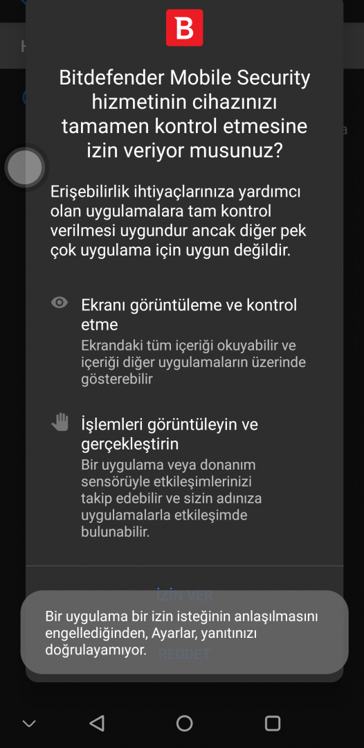 Bitdefender üyeliğim var. Mobil uygulamasını indirdim ve erişebilirlik ayarını açmamı istedi. Erişilebilirliği açmaya çalıştığımda ise şu yazı geliyor: