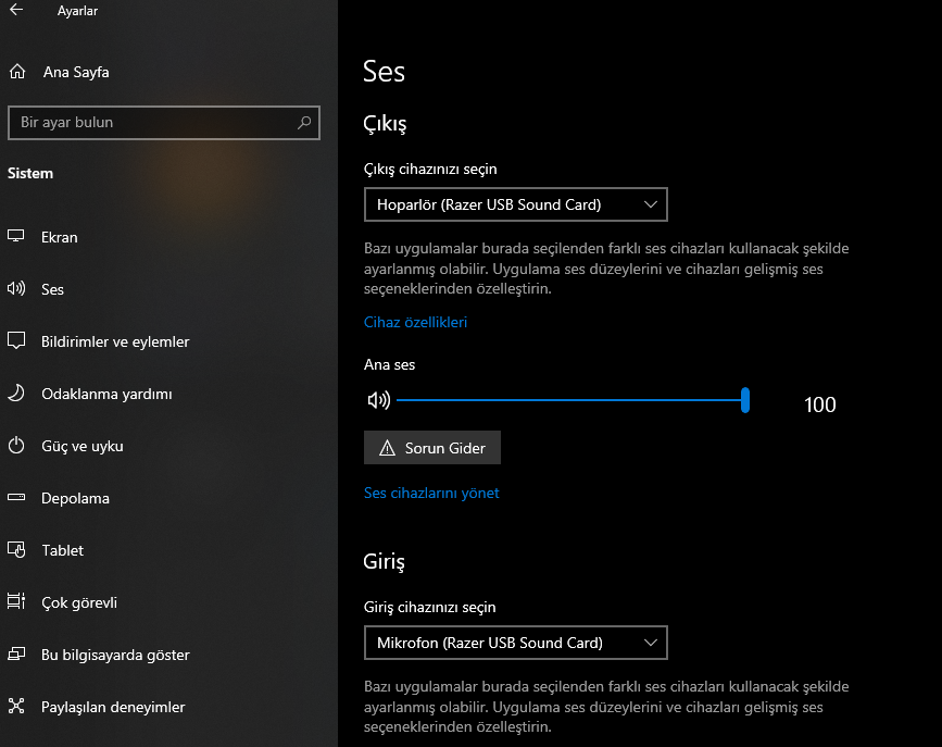 Onu yapmadan önce bilgisayarından Ayarlar > Sistem > Ses'e gidip oradaki giriş ve çıkış cihazlarının görseldeki gibi olup olmadığına bakar mısın? (Aynı şekilde DC'de de giriş çıkış cihazları var onunda seçili olduğundan emin olun.)