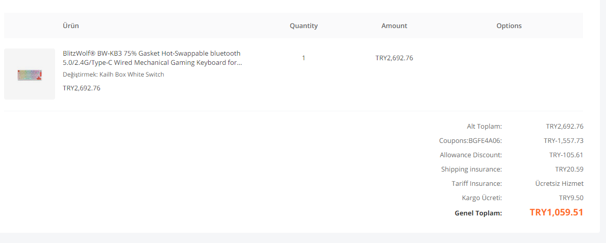 Yeni üyelikten de 4 dolar kupon verdi, ikisini birleştirdim. 1059 TL'ye geldi.