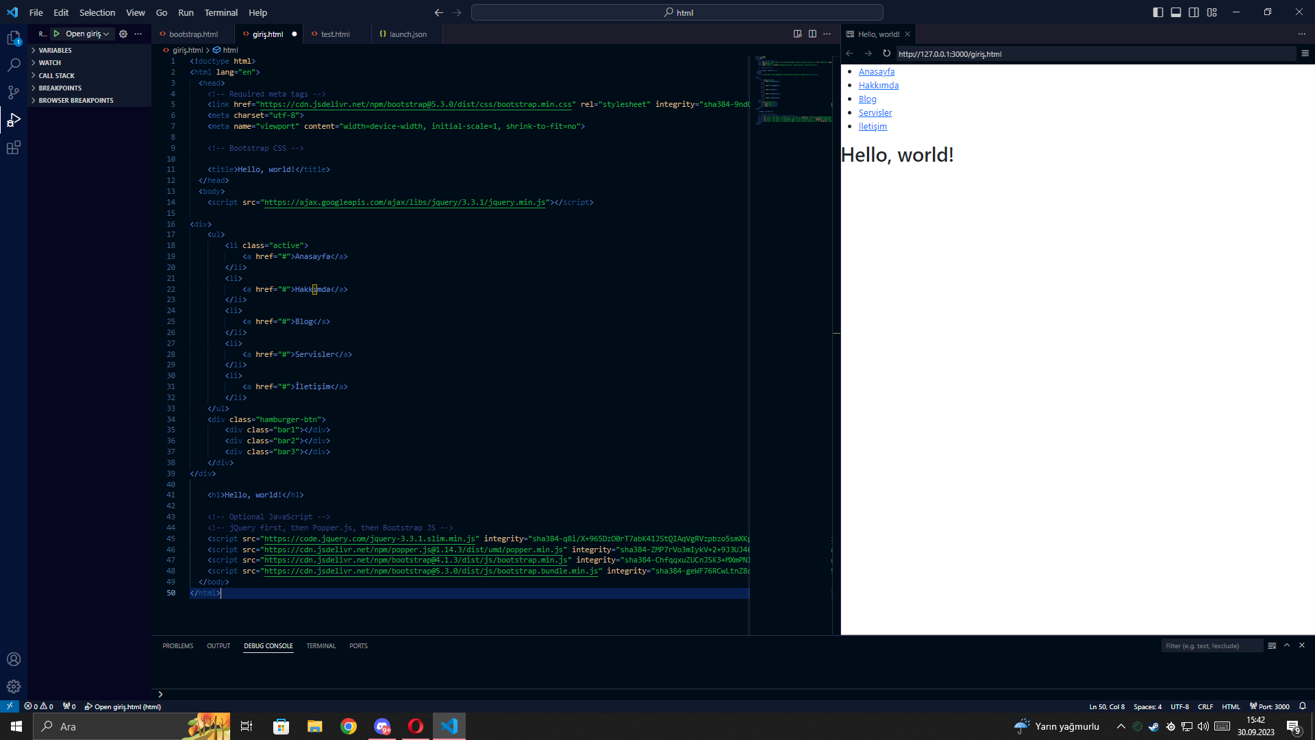 yaklaşık 2 haftadır w3schools üzerinden html öğrenmeye çalışıyorum, işlerin bootstrap ile daha kolaylaşacağını bildiğim için adım attığımda ne yaparsam yapayım kullanamadığımı fark ettim. yapmak istediğim responsive menü örneğini görsel olarak bırakıyorum kodlarını da aşağıya bırakıyorum.