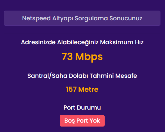Merhaba arkadaşlar. Yıllardan beri ADSL 16 Mbps internet kullanmaktan ileriye gidemedim. Başlarda 8 Mbps kullanıyordum daha sonra 16 Mbps kullanmaya başladım. Ama artık fiberi gerçekten tatmak istiyorum. Çoğu internet firmasında altyapı sorguladığımda 16 Mbps hız çıkıyor sonuç. Sadece tek bir yerde 73 Mbps çıkıyor fakat orada da resimde göreceğiniz üzere "Boş Port Yok" yazıyor. Ben bu port olayını nasıl çözebilirim acaba? Bu konuyu daha önce yaşayan ve çözümünü bulabilen var mı? Ya da NetSpeed doğru sonuçları gösteriyor mu sizce?