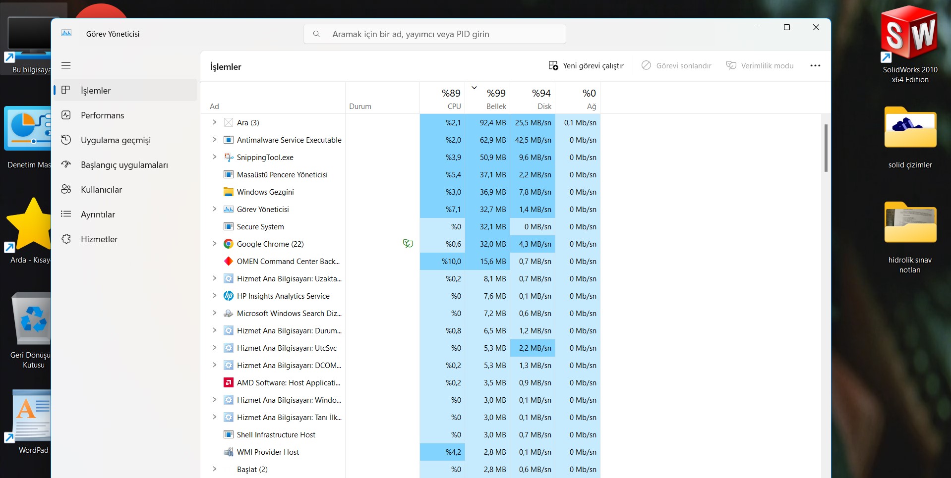 Merhaba, laptopum 8 GB RAM'e sahip boşta kullanım %100 ve kasıyor. Görev Yöneticisi'nden bakıyorum fakat kullanımı bu denli arttıracak bir uygulama yok. PC'de zaten oyun vs. veya fazla uygulama yok. Arka planda çalışan bir şey de yok. Virüs taraması yaptım, HackTool/Keygen diye bir şey çıktı araştırdım ve crackli program kullananlarda çıkabiliyormuş. Ben de crackli olarak okulum gereği SolidWorks kullanıyorum ve içinde okul için ödevler çizimler mevcut. Virüs taramasından sonra temizlersem Solid silinir ödev ve çizimlerim de gider diye korkuyorum. Başka neden olabilir? Teşekkür ederim.