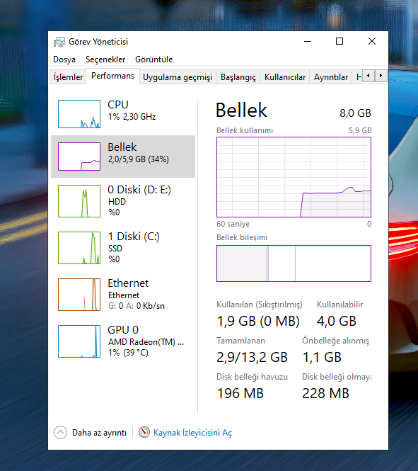 Arkadaşlar PC'yi alalım 3 ay oluyor görev yöneticisine girdim ilgimi çekti RAM kullanımı boşta 2 civarında, ideal midir? APU sistemdir RAM 8 GB ama ekran kartı yok 2 GB alıyor Vega11, PC'ye 5.9 kalıyor. 2 GB boşta normal midir RAM kullanımı bir PC için?