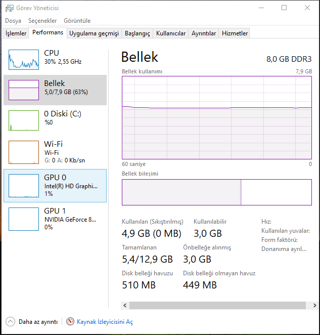 Bu arada bende de böyle 8 GB RAM'dan %62 civarı kullanılıyor. Tarayıcı + anti virüs = 900 MB civarı.