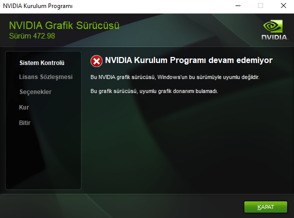 "Bu NVIDIA grafik sürücüsü Windows'un bu sürümüyle uyumlu değildir" hatası