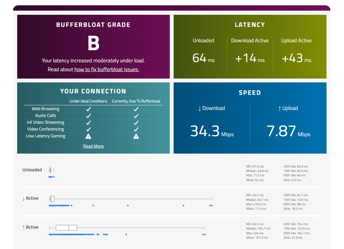 Aşağıdaki Clodflare'in sitesinden daha detaylı sonuç alabilirsiniz. Muhtemelen o bufferbloat sitesinden daha iyi bir site.