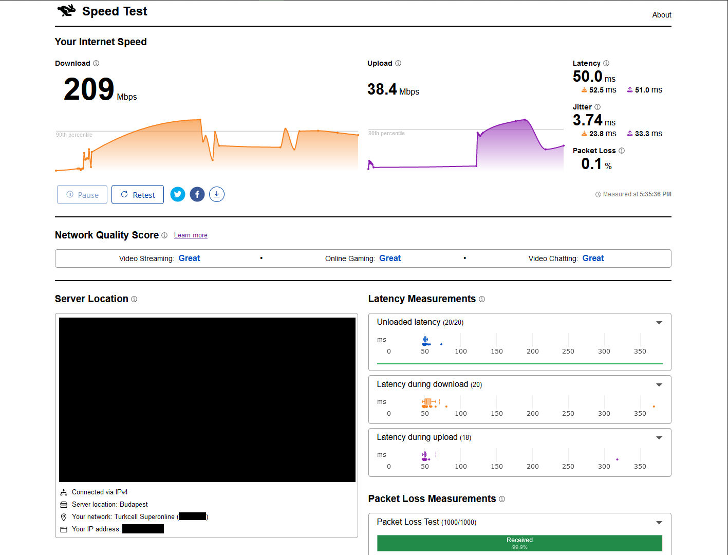 Test yaptım, nasıl? Yine bir gecikme var sanki.Aşağıdaki Clodflare'in sitesinden daha detaylı sonuç alabilirsiniz. Muhtemelen o bufferbloat sitesinden daha iyi bir site.