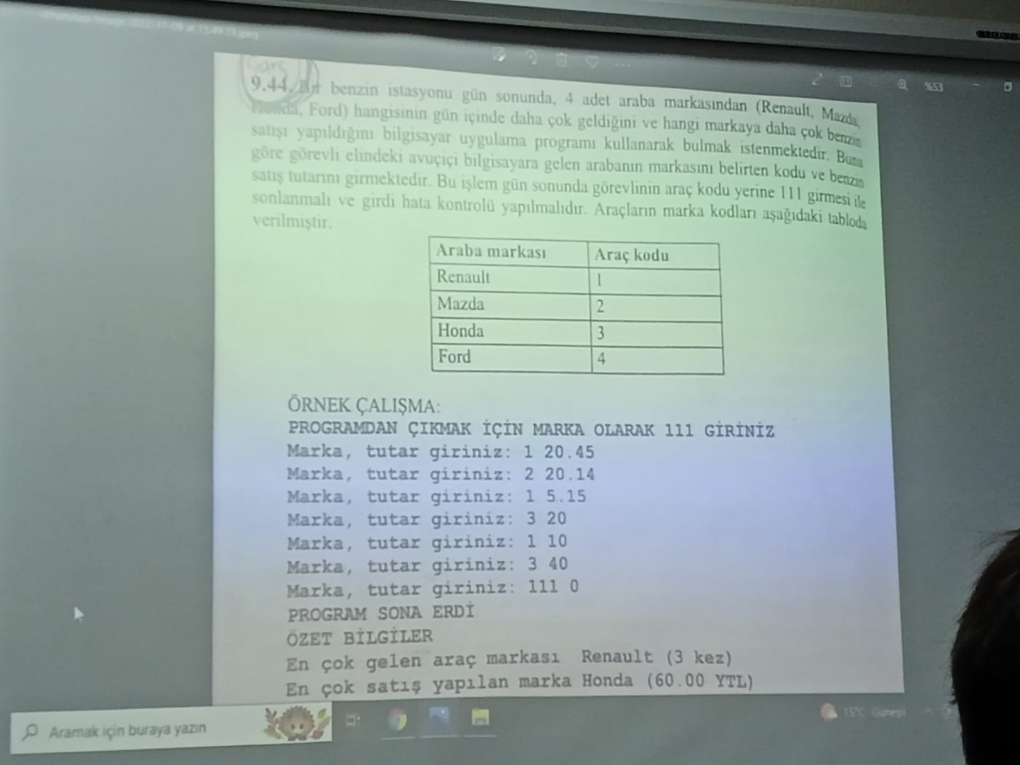 Normalde en verimli kullanım yöntemi değil ancak 4x2 değişken oluşturup verileri orada tutabilirsin. 4 markan var, her marka için geliş sayısı ve toplam yakıt satışını depolamak için değişken olusturursun. While ve if kullanarak da verilerin doğru aktarımını yaparsın. Eğer kullanıcıdan gelen girdi 1 ise Renault'un sayacina ekleme yaparsın.