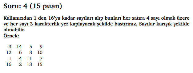 Program her çalıştığında 1´den 16´ya kadar olan sayılar farklı düzende olacak. En azından hocanın anlatımından bunu anladım. Sorunun ekran görüntüsü: Eki Görüntüle 749291