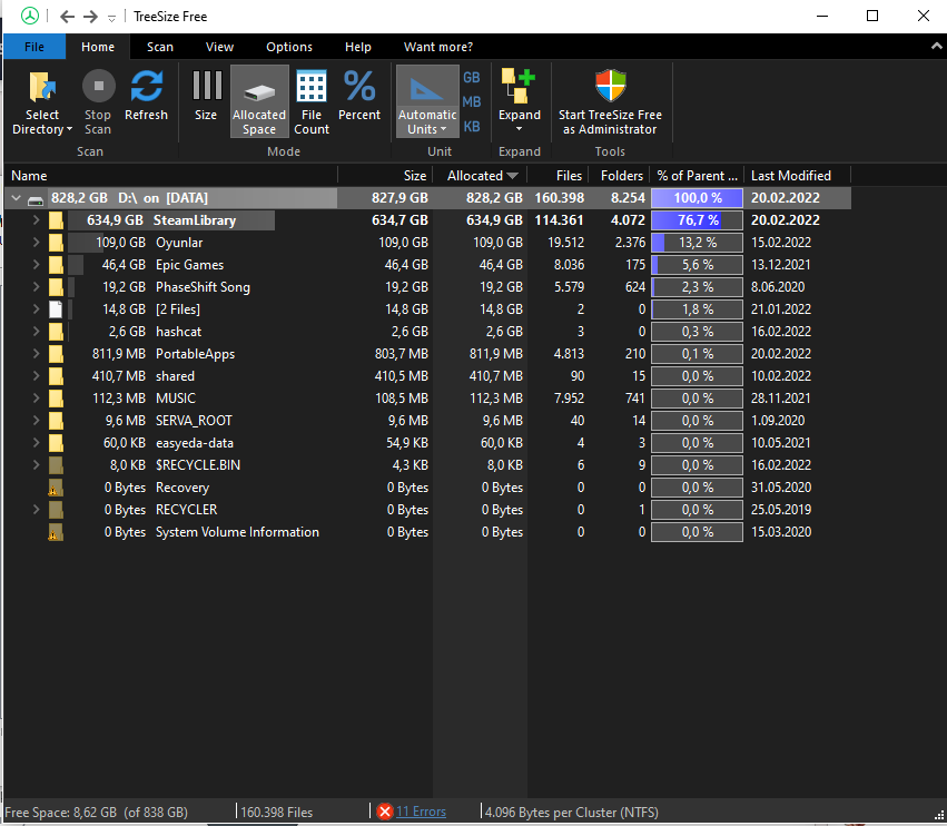 C: Diskim 256 GB SSD, 1GB'dan az yer kaldı. C:/Kullanıcılar/[kullanıcıAdı] dosyası yaklaşık 63GB, bu dosyanın içine giriyorum ama en büyük boyutlu dosya 700 MB'lık bir dosya. Gizli dosyaları göstermede açık bu büyük boyutlu dosyaları nasıl görürüm nerededir?