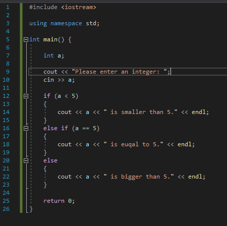 "a" değişkenine girilen değer 5'ten küçükse "is smaller than 5." yazdır. Küçük değilse eğer 5'e eşit mi diye kontrol et. Eğer 5'e eşitse "is equal to 5." yazdır. 5'e eşit değilse eğer 5'e eşit olmayan ve 5'ten küçük olmayan herhangi bir değer olacağı için "is bigger than 5." yazdırıyor.
