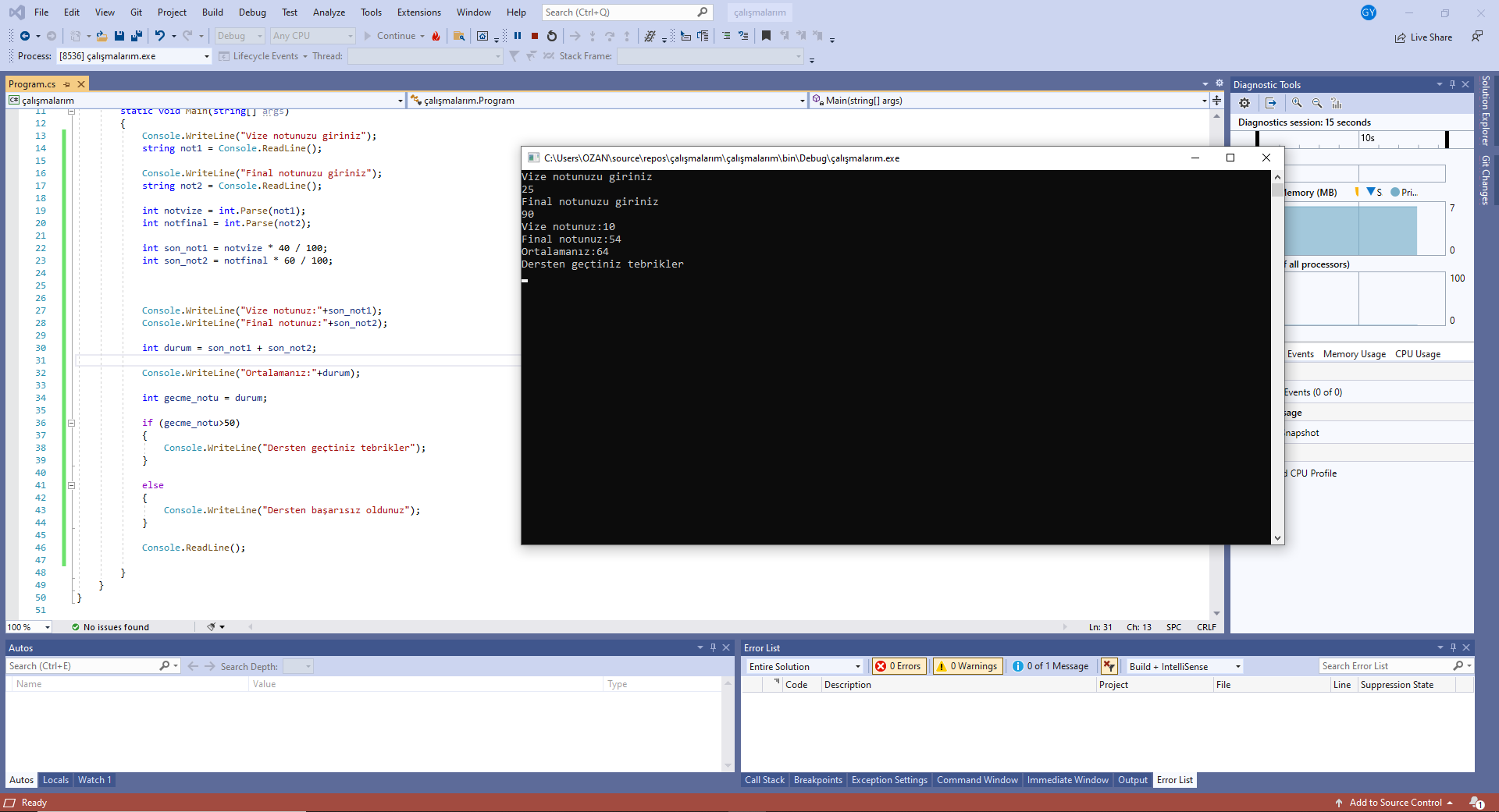 Arkadaşlar C# ile yaptığım çok basit not hesaplama programı. Vize + final ortalamasını alıp 60 barajına göre geçip geçmediği bilgisini veriyor. Daha da düzenlenebilir farkındayım yeni başladım ve çok basit bir şekilde yaptım. Biraz daha uğraşıp kullanıcıdan vize, final yüzde bilgisini kendisinin belirlemesini isteyebilirim. FF, DD gibi not koşulları ekleyebilirim. Biraz hoşuma gittiği için burada paylaşmak istedim. Daha yeniyim mevzuda.