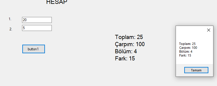 MessageBox.Show("Toplam: " + toplam + "\n" + "Çarpım: " + carpim + "\n" + "Bölüm: " + bolum + "\n" + "Fark: " + fark);[/CODE]