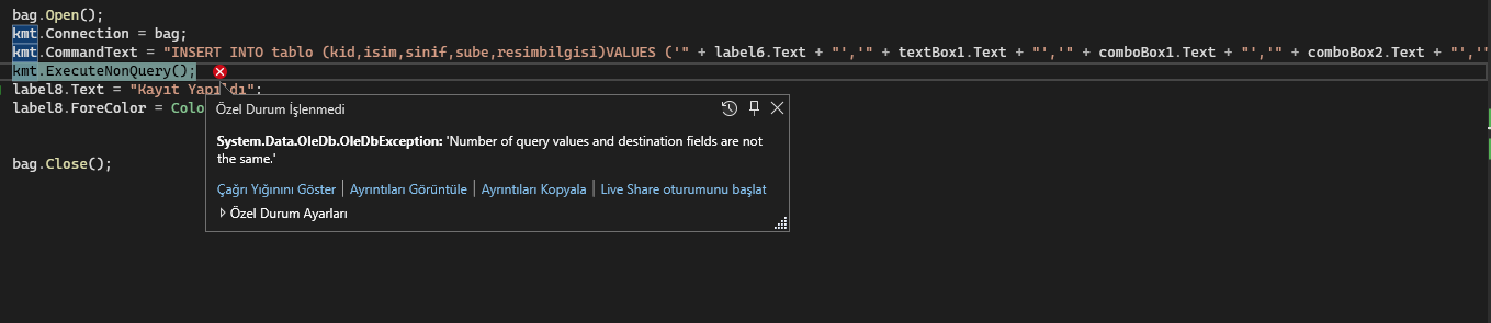 kmt.CommandText = "INSERT INTO tablo (kid,isim,sinif,sube,resimbilgisi)VALUES ('" + label6.Text + "','" + textBox1.Text + "','" + comboBox1.Text + "','" + comboBox2.Text + "','" + textBox2.Text + "',')";