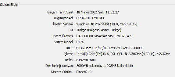 Casper laptopum var. Modelini bir türlü öğrenemiyorum. Sistem modeli "D15s" yazıyor ama Google'da arattığım zaman sonuç yok.