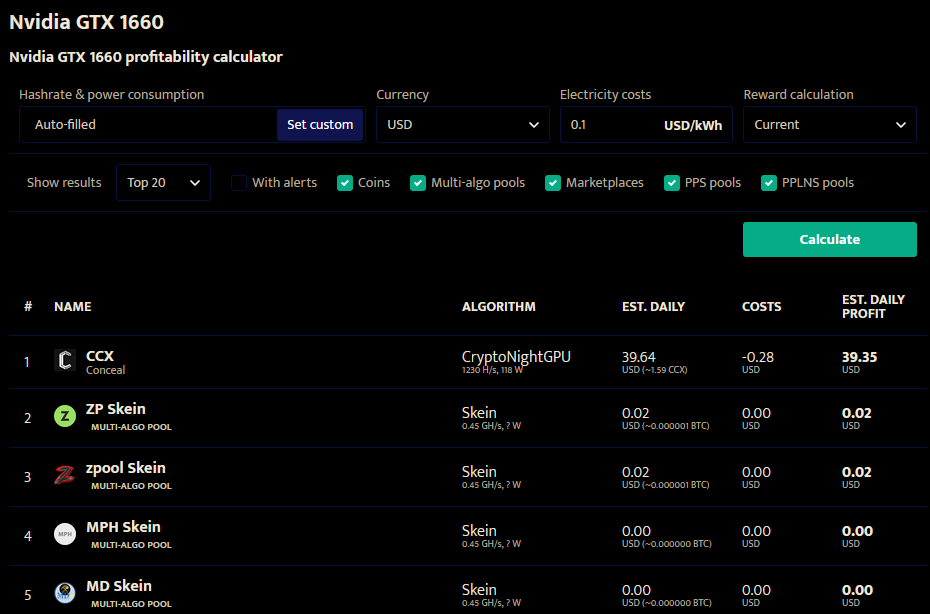 Yani oylesine eski gunluk kazanca bakip duygulanmak icin "GTX 1660 mining calculator" yazmistim ve o birkac centleri bir daha gormek istiyordum fakat bu nedir? $39, 35 buyuk para bir de gunluk. Biraz baktim da yani bu kadar para kazandiriyorsa malum oglun basardi anne editine donusurum.
