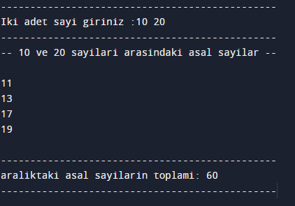 printf("\n-----------------------------------------------\naraliktaki asal sayilarin toplami: %d\n-----------------------------------------------",toplam);