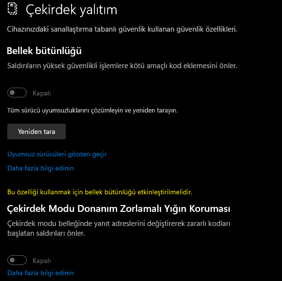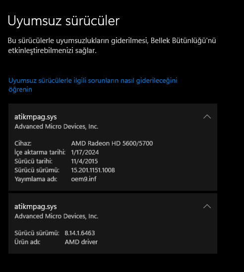Bugün sabah Valorant oynamak için bilgisayarımı açtım ve bir hatayla karşılaştım. Technopat'taki gördüğüm konularda "çekirdek yalıtımı" adlı yerdeki bir şeyi açmam gerektiği yazıyor. Fakat oradaki şeyi etkinleştiremiyorum. Uyumsuz sürücüler kısmına girdiğimde AMD modelinde bir ekran kartının sürücüsü gözüküyor fakat benim AMD ekran kartım yok. Eğer oradaki ".sys" dosyasını silersem bir sıkıntı çıkar mı?