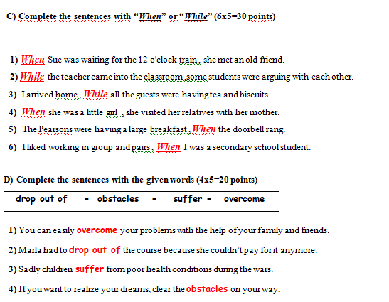 C) Complete the sentences with “when” or “while” (6x5 = 30 points)