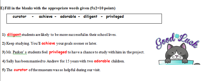 D) Complete the sentences with the given words (4x5 = 20 points)