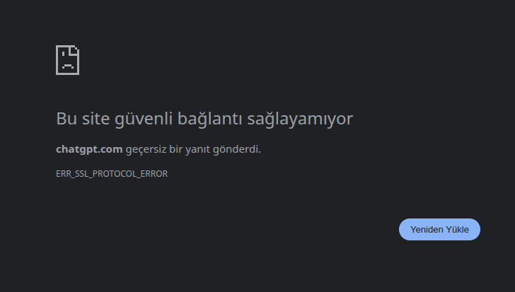 Diğer bilgisayarımda ve cihazlarımda bu Wi-Fi ile sorunsuz ChatGPT'ye erişebiliyorum fakat Ubuntu üzerinden erişemiyorum. Aslında erişebiliyordum ama şu anda giremiyorum, bu hatayı veriyor.