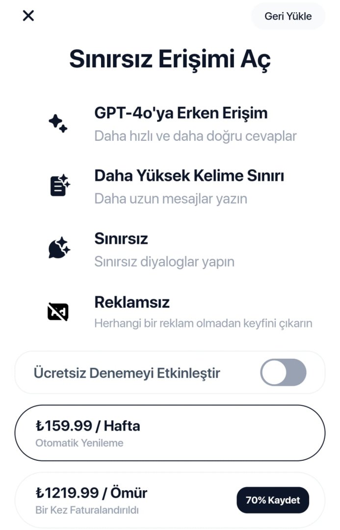 Hocam %70 indirim yapılmış ondan ucuz.Merhaba, ChatGPT'nin uygulamasında gezerken üyelik seçeneklerinde "ömür" yazan seçenekte vardı. Acaba bu kalıcı, sınırsız anlamında mı? Öyleyse çok garip ve ucuz geldi gözüme.