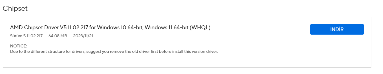 Anakart sitesi üzerinden chipset yükleyecektim fakat sürümü 2023.11.21 tarihine ait. AMD'nin sitesinde 03.13.2024 tarihinde güncellenmiş. Fakat ben de AMD sitesindekini yükleyemiyorum, hata veriyor.