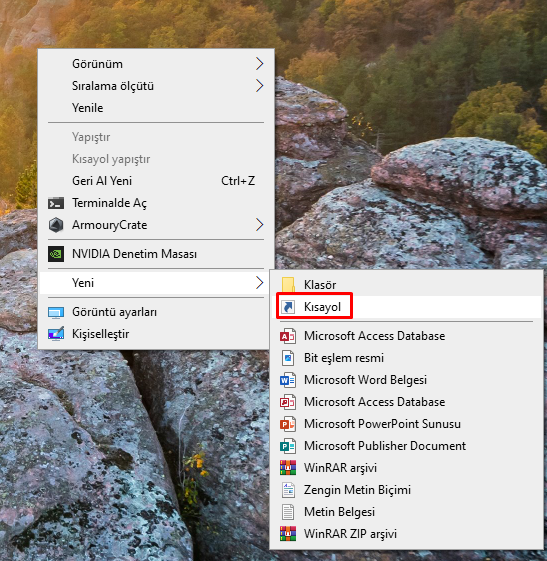 Sonra masaüstünde sağ tık.