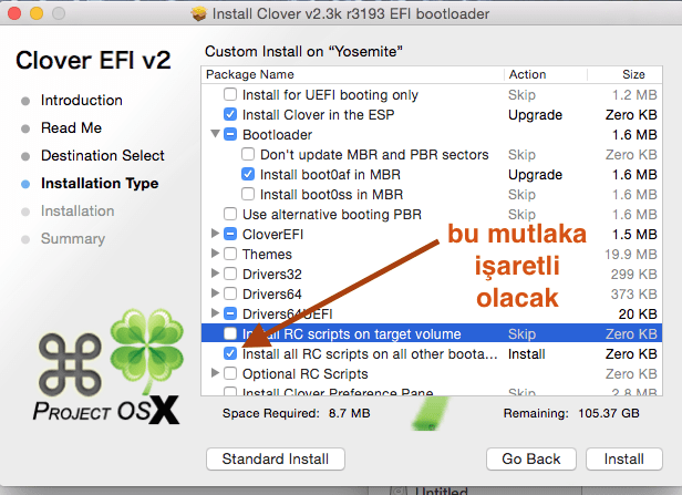 • Clover Bootloader aç. Şu resimdeki gibi kurulum yap:
