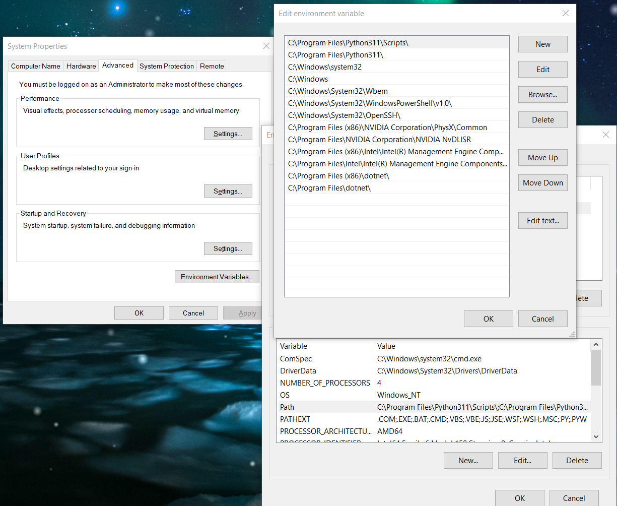 Başlata ortam değişkeni falan yazın orada çıkar. Onu açın. Soldaki pencere açılacak. Pencerenin sağ altındaki butona basın, sağ alttaki pencere açılacak. Orada aşağıdaki kısımdan Path yazana elip düzenle deyin, sağ üstteki pencere açılacak. Oraya Python klasörünüzü ve Scripts klasörünüzü ekleyin. Bendeki varsayılan yükleme konumu değil, elimle seçtim. Varsayılanı C:\Users altında bir yerlerde.