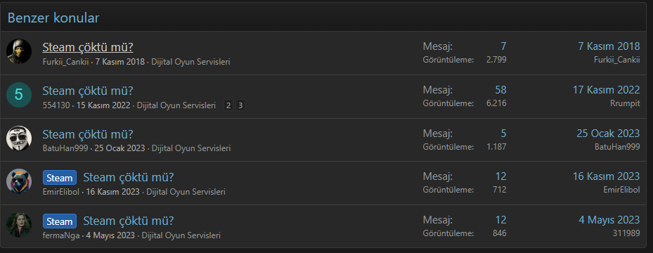 @ExellionTR, tepkim her hafta aynı şekilde açılan konulardan dolayı oldu biraz benim. Çünkü Google'a "Steam çöktü" yazdığınızda binlerce konu çıkabilir sanırım. Hatta hemen aşağıda konuları çıkıyor. Bu yıllardır asla bitmeyen, her hafta aynı konu bir şekilde açılan bir şey.