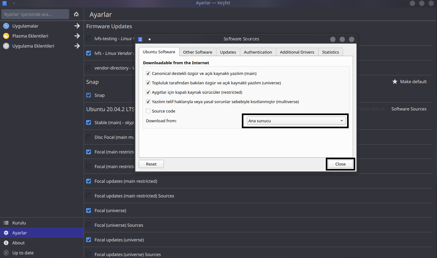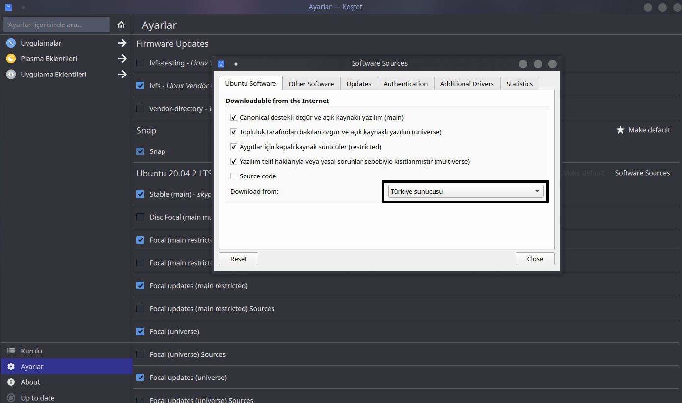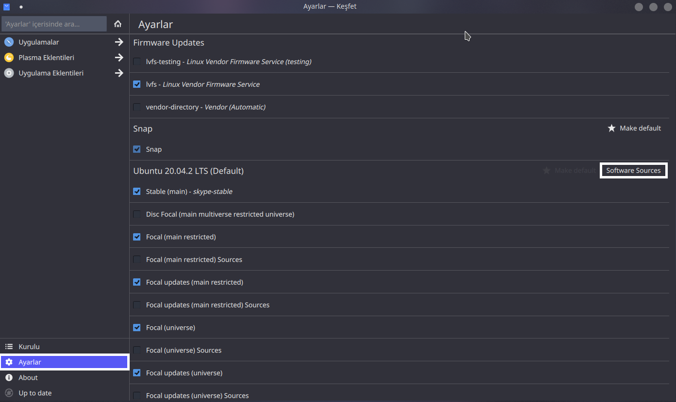 Bu sorunun çözümü ise yansımızı "Türkiye sunucusu" yerine "Ana sunucu" olarak değiştirmekten geçiyor. Ben Kubuntu yani KDE kullanan bir Ubuntu dağıtımı kullandığım için görselde farklılıklar olabilir fakat adımlar ve işlemlerin gerçekleştirildiği kısımlar her Ubuntu dağıtımında aynıdır. Öncelikle "Yazılım Merkezi"ne giriş yapalım ve sol alt köşeden "Ayarlar" kısmına gelelim. Ardından sağda yer alan "Software Sources" butonuna tıklayalım.