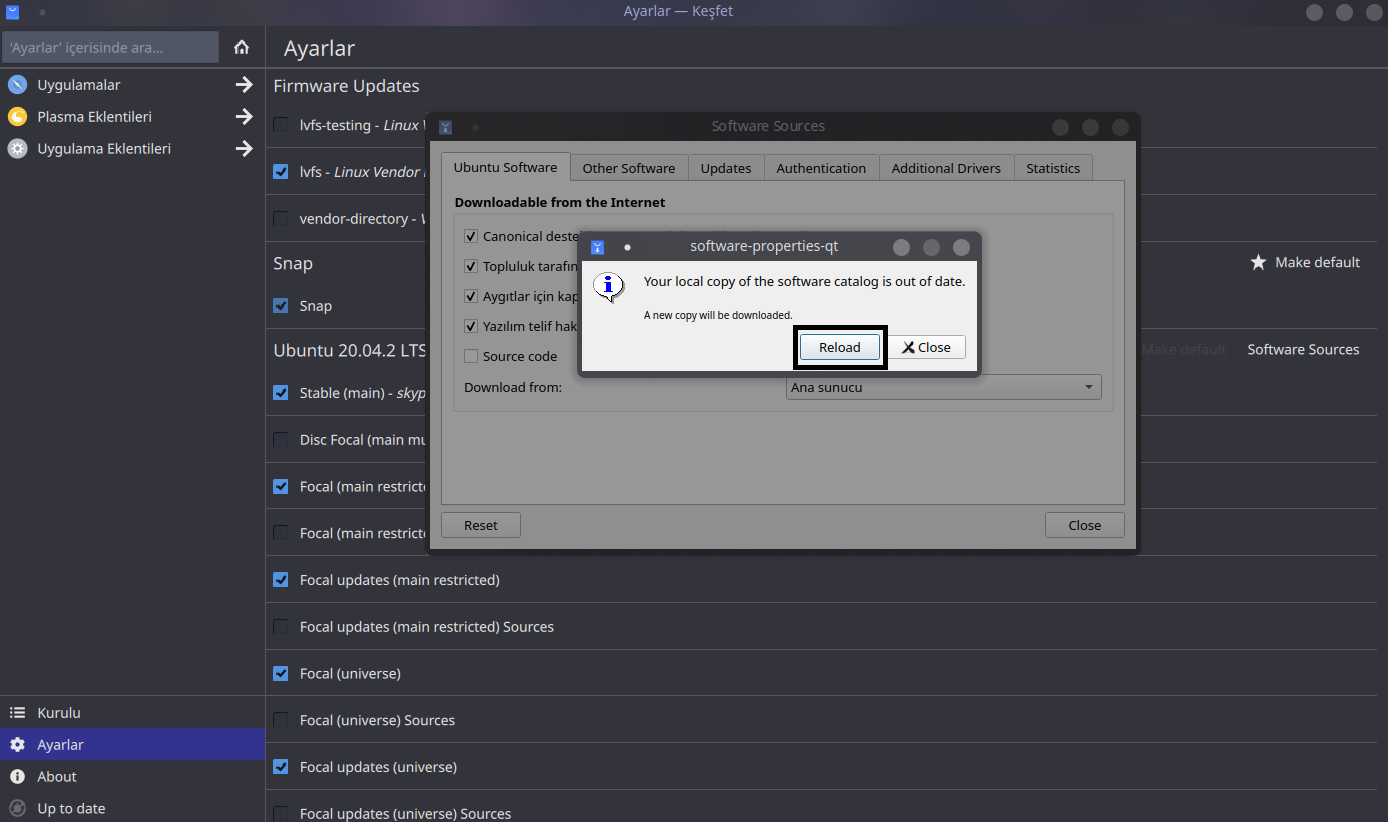 Bu aşamada yansımızı değiştirdiğimiz için yereldeki software catalog kapsam dışına çıktığı için yenilemek için izin istiyor. "Reload" diyelim.