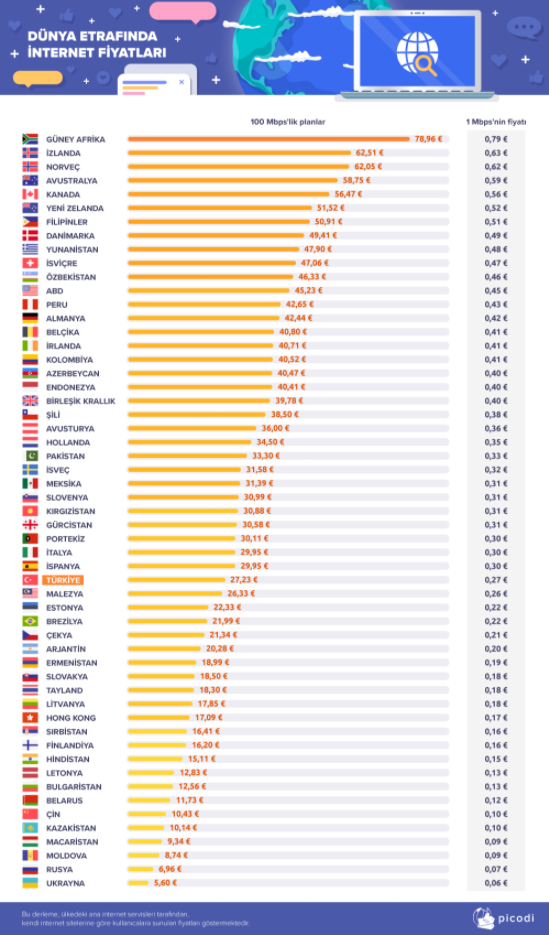 100 MBit'i Türkiye'de kaç kişi alıyor?Açıkcası araştırma yapmadan sadece batı fanboyluğu olan birinin yorumunu görüyorum burada. ABD'nin interneti bizimkinden geride. Birim fiyat karşılaştırma olayı da saçma;