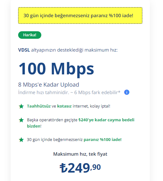 "Türk Telekom yetkilileri altyapınızın 35Mbps desteklediğini iletmişlerdir. Talebiniz olması durumunda paket değişikliğinizi sağlayabiliriz. İyi günler dilerim."