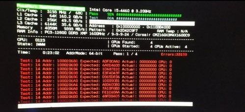 Velhasıl yeni ekran kartı, anakart ve PSU aldım. PSU 0, diğerleri ikinci el ama her parçayı test ederek aldım, sağlam olduklarına eminim neredeyse. O yüzden geriye RAM kaldı, ben de Memtest yapayım dedim. İlk 2 RAM takılıyken denedim test direkt 40. dakikada falan dondu kaldı. Sonra RAM'leri tek tek test edeyim dedim. Biri 12. testte, diğeri de 14. testte videodaki gibi oluyor ve hataların sonu gelmiyor 200-300 bine kadar gidip devam ettiği için kapattım artık.
