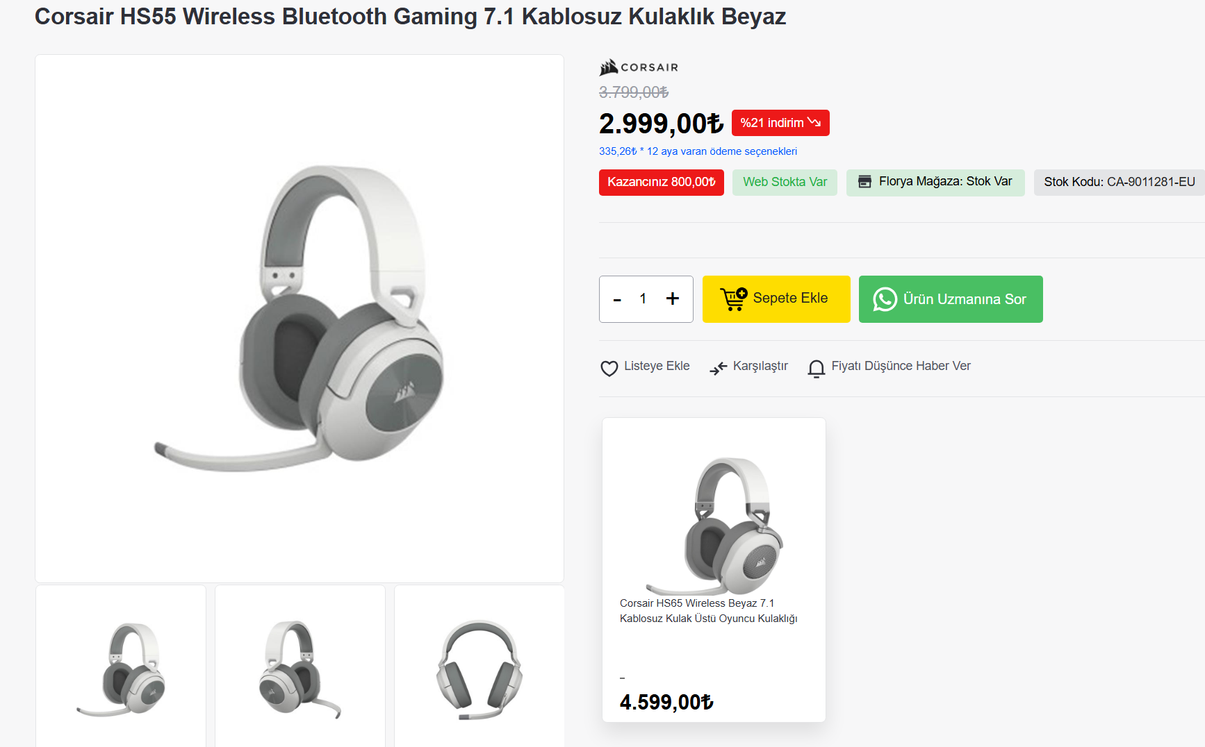 CORSAIR HS55 Wireless 7.1 Gaming Headset – Bluetooth & USB Kablosuz Kulaklık – Beyaz