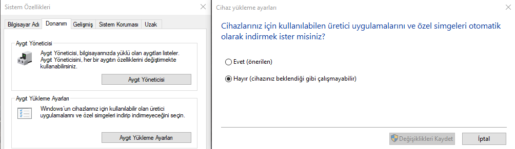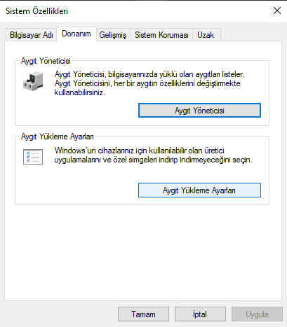 3. Gelen menüden donanım kısmına gelip aygıt yükleme ayarları butonuna basın,